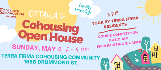 Terra Firma Cohousing Community opened their doors for National Cohousing Day to host many cohousing groups in Ottawa. We were joined by the Soul Sisters, Concorde Cohousing, Great Rivers, Fiddlehead Commons and the WOCO seed group (West Ottawa Cohousing). Terra Firma led a tour of their cohousing community on this sunny spring day. A music jam was had, face-painting for the kids, and Maya of Great Rivers took the cookie championship!